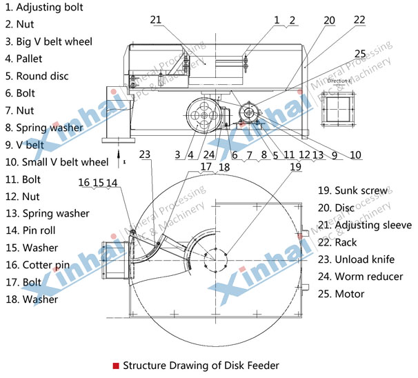 Bulk materials are loaded into the receiving cylinder from the hopper. The materials are not exposed to the wall of the cylinder and piled on the disc by their own weight. Adjust the gap between the sleeve and the disc by adjusting the bolt to control the natural pile of materials on the disc. angle. When the disc rotates, the material is evenly scraped by the discharge knife on the disc to the outside of the disc and falls, so that as the disc rotates, the material is evenly scraped into the receiving hopper by the discharge knife. Continuous operation of the disc completes the uniform feeding operation. Adjusting the gap between the unloading knife and the disc can also control the amount of feed. When working, the motor drives the disk mounted on the worm reducer to rotate through the pulley.